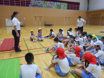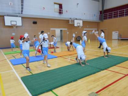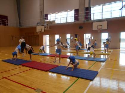 今日は、外部から指導員の方をお招きし、マット運動について教えていただきました。壁倒立や、側転のコツを知って、どんどん高く足が上がるようになっていました。