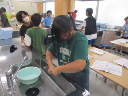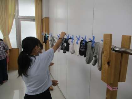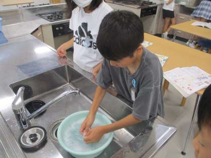 家庭科「夏をすずしくさわやかに」の学習では、手洗い洗濯の実習を行いました。初めて手洗いをした子供たちも多く、手で洗うことに新鮮さを感じている様子でした。目に見える汚れが、自分の手で洗うことできれいになった時や、目には汚れが見えないのに、水の色が濁り、汚れていたことを感じた瞬間には、興奮した様子で友達と話し、きれいになる喜びを感じていました。夏休み期間も家で洗濯に挑戦してみたいと張り切る子供たちの姿が見られました。