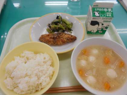 本日の献立は、魚の竜田揚げ、梅肉和え、白玉汁、です。 ※ 今日は、1学期最後の給食です。