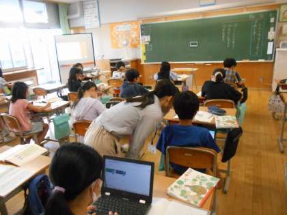 2年生が算数の総まとめを行っていました(左)。4年生が国語で端末を使い(中)、作品鑑賞を行っていました(右)。