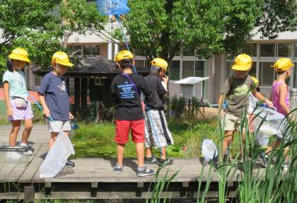 生活科の学習で、ビオトープに出て生き物を探しました。「暑さなんて、何のその!」と言わんばかりに、夢中になっています。
