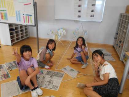図画工作科では、新聞を丸めて棒状にし、つないで形作る活動をしました。「どんなものを作りたい?」と問いかけると、「タワーを作ってみたい」「小屋を作ってみたいな」と作りたいものを想像していました。