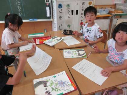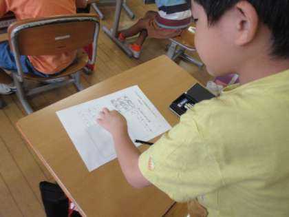 たて、よこ、ななめに言葉がかくれている問題をつくりました。つくった後は、グループの友達と交換して、問題を解き合いました。