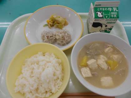 本日の献立は、チンズワンズ、コーン和え、さつま汁、です。