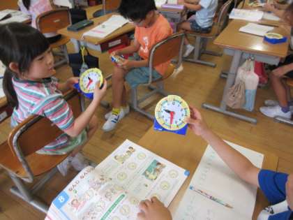 模型の時計を使って、短い針と長い針の動きを確かめました。