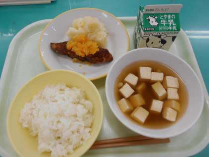 本日の献立は、ふくらぎのマリネ、こふきいも、すまし汁、です。