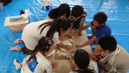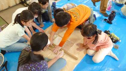こねた生地を20分ねかせて、麺棒で伸ばします。うどんらしくなってきました。