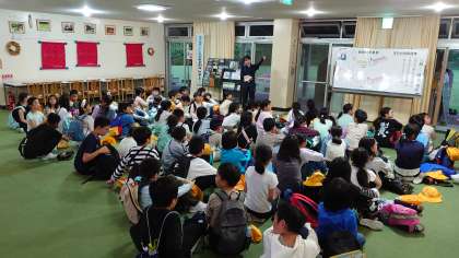 雨にも降られず、無事にオリエンテーリングを終了しました。オレンジジュースを飲んで小休止した後、今後の活動についての確認をしています。