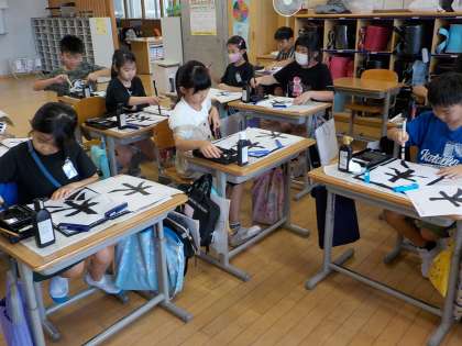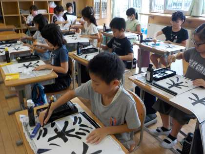 3年生から始めた毛筆も、「右はらい」「左はらい」を習うまでになりました。習字道具の準備や後片付けは、もう、自分たちで素早くすることができます。新しく習うことは、どきどきしますが、うまく書けたときは、「できた」と歓声が上がります。集中して書いている姿が、とてもいいですね。