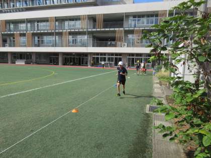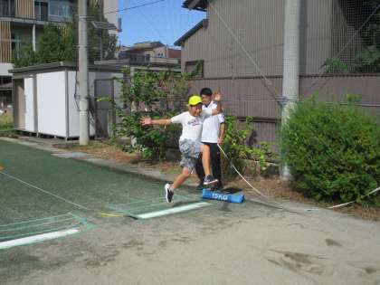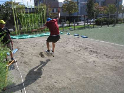「走り幅跳び」の練習では、「自分に合った助走距離で、助走のスピードを上げること」「目線を上げて、足の裏全体で踏み切ること」を意識しながら練習しています。子供たちは自分の記録の伸びを実感し、より意欲を高めています。