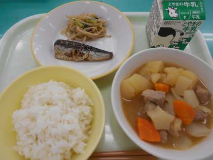 本日の献立は、いわしの土佐煮、ごま和え、豚肉とジャガイモの南蛮煮、です。