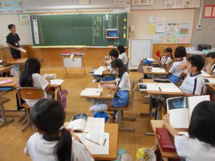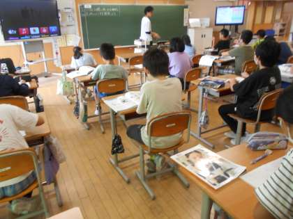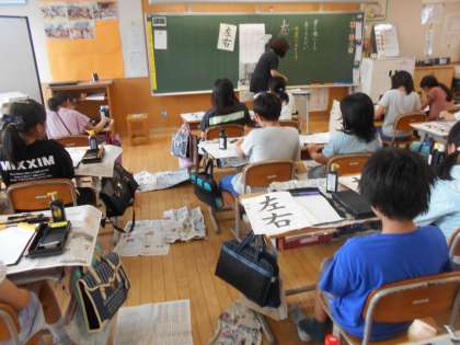 写真は、3年生が国語で「モチモチの木」(左)、4年生の書写「左右」(これが難しい中)、5年生の理科(右)です。