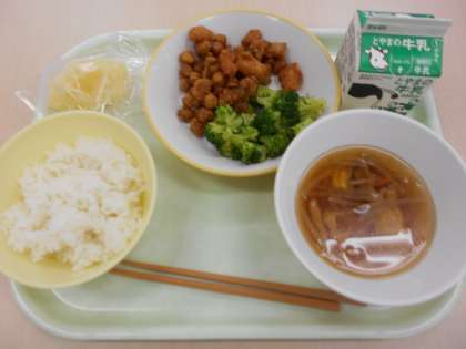 本日の献立は、鶏肉とひよこ豆の甘からめ、茹でブッロコリー、沢煮碗、冷凍リンゴ、です。