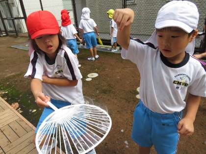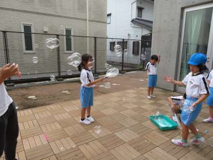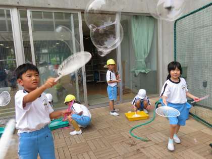 しゃぼん玉遊びをしました。うちわの骨組みやストローなど身近な物でしゃぼん玉をつくりました。ストローを切って長さを変えてみるなどしゃぼん玉がたくさん出るように工夫していました。