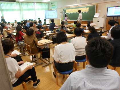 教員研修の為、一斉下校した翌日26日(火)です。本校では5年生が、1組は家庭科(左)、2組は体育科(中)で行い、沢山の先生方が参加しました。5年生の子供たちも頑張りました。その5年生は、今日「情報モラル」を学びます。