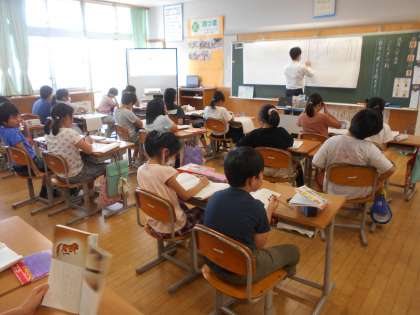 写真は、4年生の国語に挑戦している(右)ところです。
