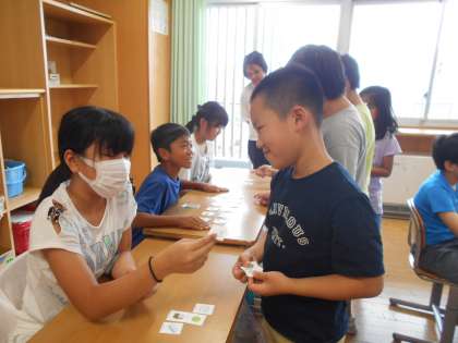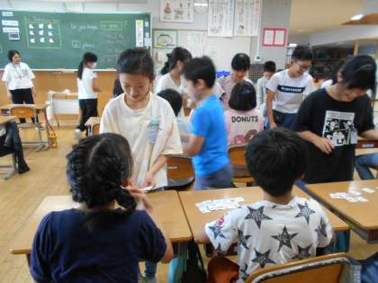 外国語活動では、「Do you have〜?」の言い方を練習しています。今日は、子供たちが文房具屋さんとお客になりきって、尋ねたり答えたりしました。