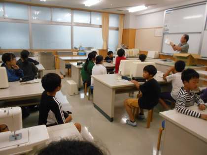 写真は、3年生のスーパー見学の振り返り(中)と、6年生の家庭科ミシン裁縫です(右)