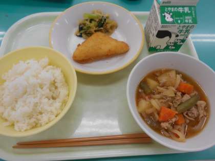 今日の献立は、はんぺんフライ、はりはりあえ、にくじゃがです。