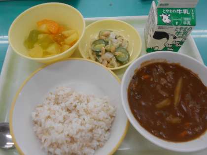 本日の献立は、たべきりんハヤシ、大豆サラダ、フルーツゼリーミックス、です。