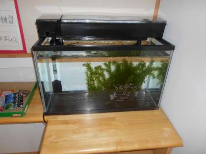 玄関の水槽にメダカが入りました(左)。