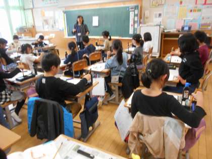 写真は、1年生の学習発表会の練習の様子(中)と3年生の書写です(右)。