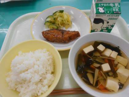 本日の献立は、ふくらぎの胡麻だれかけ、合わせ和え、マコモダケのお吸い物、です。