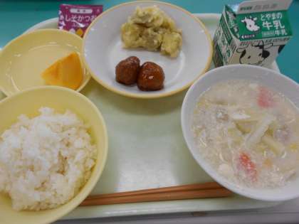 本日の献立は、ミートボール、チーズおさつ、豆乳野菜スープ、かき、しそかつおふりかけ、です。