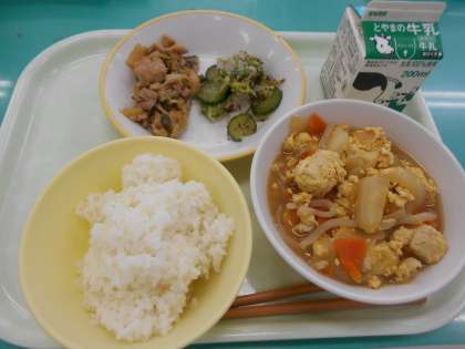 本日の献立は、あっさりチキン、ゆかり和え、卵とじ、です。