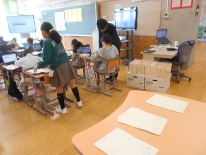 写真は、左から1年生の体育、5年生の算数(プリント選択で個別最適化の学びか)、木曜日のクラブ活動(卒業アルバム用の左心撮影)です。