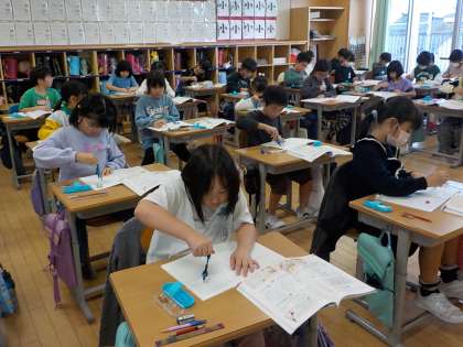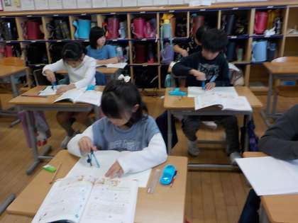 算数科では、コンパスを使って円をかく学習をしています。はじめてコンパスをもつ子供たちにとって、コンパスは、なかなか手強い相手です。途中までは円くかけるのに、その後がどうにも回らない、うまくいかない、と嘆きの声が聞かれました。しかし、どんどんと練習を重ねていくうちに、次第にコツをつかんできている子供たちです。