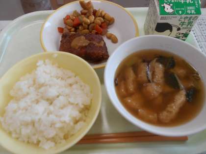 本日の献立は、魚の甘味噌かけ、五目煮豆、うすくず汁、です。