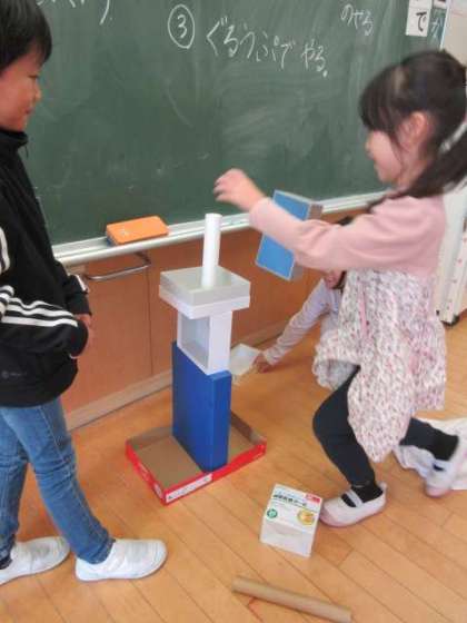 箱を使っていろいろなものを作りました。どうしたら積み上げた箱が倒れないか、どうすればもっと高いタワーを作ることができるかなど、グループで話し合いながら活動していました。