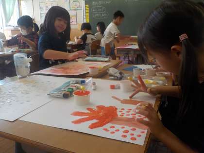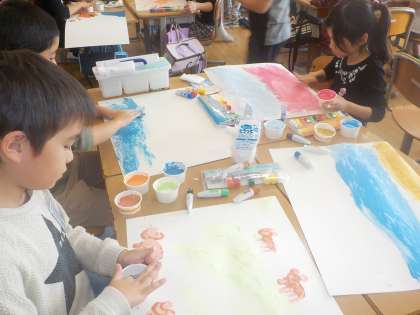 真っ白なとろとろ絵の具に好きな色の絵の具を混ぜ合わせて、思い思いに指や手で描くことで、想像を膨らませた作品を作りました。