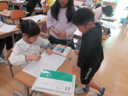 国語科の学習では、漢字のクイズをつくりました。子供たちは、友達がつくったクイズを興味深そうに解いていました。