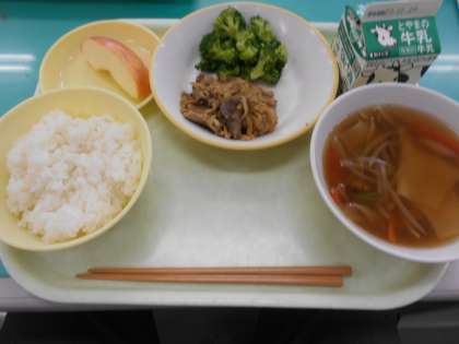 本日の献立は、スタミナレバー丼、茹でブロッコリー、ワンタンスープ、りんご、です。