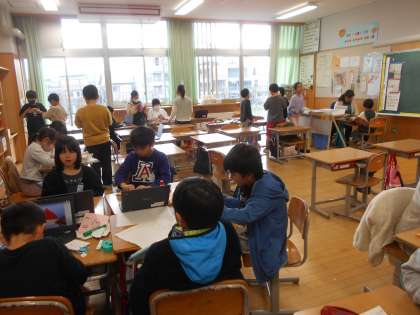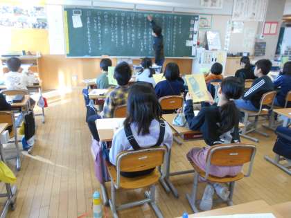 3年生が係活動、4年生が伝統工芸(国語)で学んでいました(中、右)