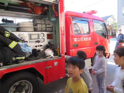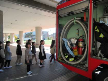 自衛消防訓練のために学校に来ていた消防車を特別に見せていただきました。間近で見る消防車に子供たちは大興奮でした。