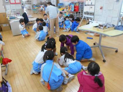 HPでも紹介したように水曜日に、避難訓練を行い、消防暑の方が消防車で来られました。国語で「はたらく車」について学んでいる1年生が見学をしました(左)。1年生は来週、年長児を迎えます(中)。