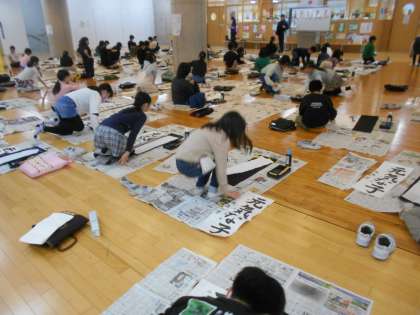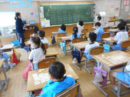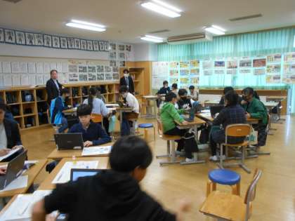 いつの間にか長縄、書き初めが始まっています。写真は、4年生のランチルームでの書き初めの練習と6年生の社会です(左、中)。