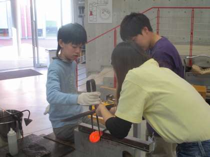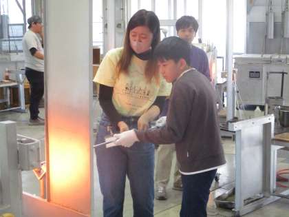 3日間かけて、クラスごとに富山ガラス工房へ卒業記念品制作学習に行ってきました。始めにガラス作家の方の説明を聞いて、自分のつくりたいペーパーウエイトの形や色を決めました。その後、順番に一人ずつガラス作家の方に手伝っていただきながら作品を制作しました。