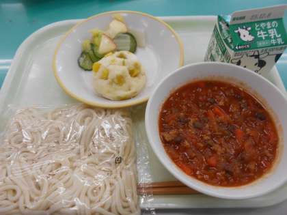 本日の献立は、ソフト麺、ミートソースかけ、蒸しパン、白菜とリンゴのサラダ、です。
