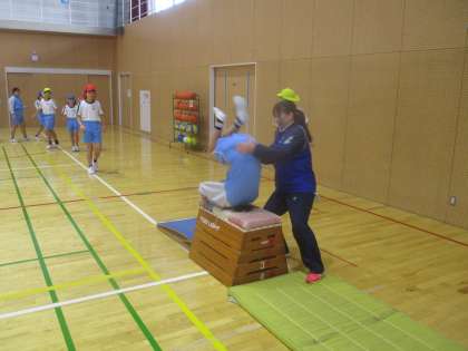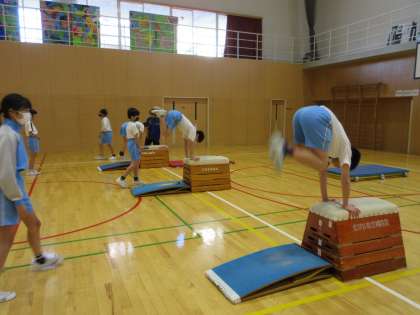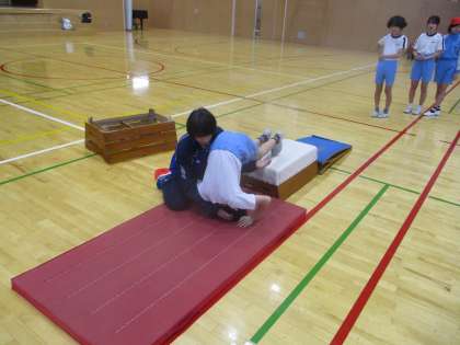 富山市スポーツ協会から2名の先生方が来られ、跳び箱の指導をしてくださいました。踏切板を使って腰を高く上げる練習や、マットを使った前転の練習を行うなど、台上前転に取り組むための基本的な技能を教えていただきました。子供たちは最初は台上前転に対して不安感をもっている様子でしたが、徐々に不安感も消え、きれいに台上前転できる子供たちが増えていきました。