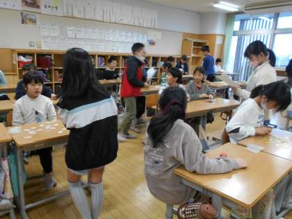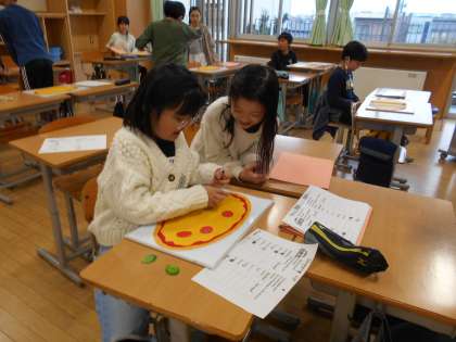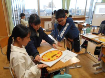 外国語活動では、What do you want?と尋ねて答えることを生かして、友達の好みに合わせたピザ作りをしました。お店の店員や客になりきって、会話を楽しみながら活動できました。