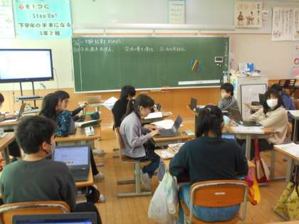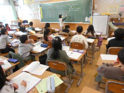 写真ですが左から、2年生の算数、5年生の理科、6年生の百人一首練習です。2年生は、最大の壁「かけ算九九」を終え、活用編に向かっています。先生の周りで「かけ算九九」テストを受ける子が沢山います。