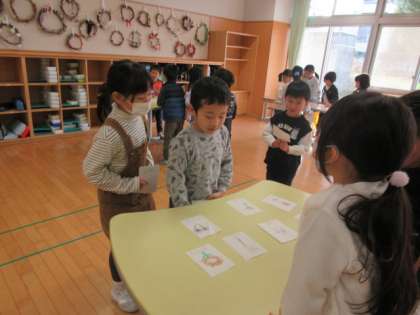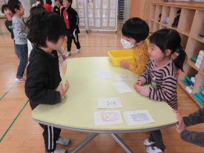 国語科の学習でお店屋さんごっこをしました。自分で商品の絵と名前をカードに書き、お客さんに売りました。「おすすめはなんですか。」と尋ねるなど、お店屋さんとお客さんとのやり取りを上手にすることができました。