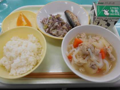 本日の献立は、いわしの土佐煮、ゆかり和え、塩肉じゃが、あいか、です。