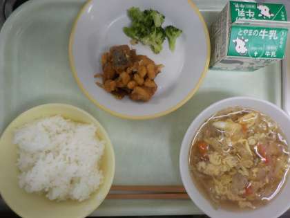 本日の献立は、ごはん、牛乳、魚と大豆のねぎソースからめ、ゆでブロッコリー、中華かきたま汁 です。今日の給食が、今年最後の給食です。来年もおいしい給食を作ってまいりますので、よろしくお願いいたします。