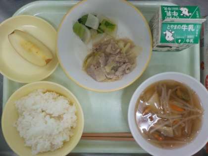本日の献立は、ごはん、牛乳、豚肉の塩こうじ炒め、かぶのいろどり、ワンタンスープ、りんご です。