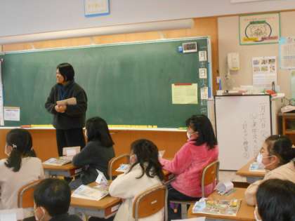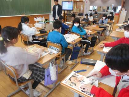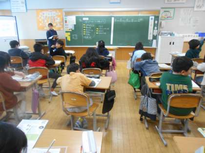 写真ですが左から、3年生の外国語活動、4年生の算数、5年生の理科です。理科では、生命の神秘を米粒で表しています。
